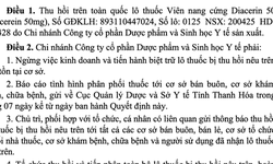 Lô thuốc viên nang cứng Diacerin 50 bị thu hồi trên toàn quốc do không đạt tiêu chuẩn chất lượng về chỉ tiêu hàm lượng nước.